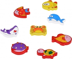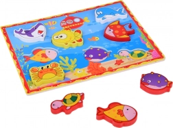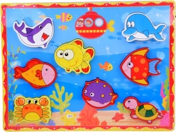 De houten inlegpuzzel Zee JOKOMISIADA combineert leren en plezier in één. Stevige, massieve stukken zijn gemakkelijk vast te pakken en passen precies in de gefreesde openingen van de houten plaat. Kleurrijke illustraties van zeedieren prikkelen de fantasie en wekken nieuwsgierigheid.