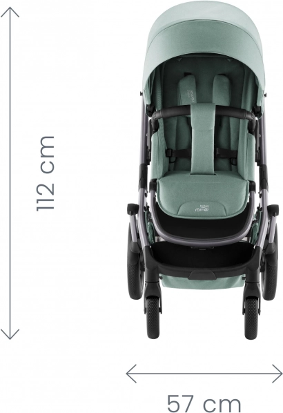 Geveerd frame, grote lekbestendige rubberen wielen en een compacte breedte van 57 cm voor vlot manoeuvreren in de stad en in de natuur. Extra kap met UPF 50+ en een ruime mand met een draagvermogen van 7 kg.