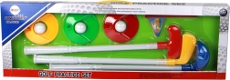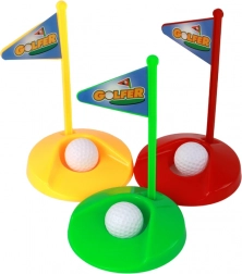 Deze kleurrijke minigolftset biedt alles wat kinderen nodig hebben om te spelen: 3 duurzame clubs (ca. 52 cm), 3 holes in de kleuren groen, rood en geel, 3 startvlaggetjes en 3 witte ballen (diameter ca. 3,5 cm). Elke club heeft een andere clubhoofdvorm, wat strategie en variatie aan het spel toevoegt.