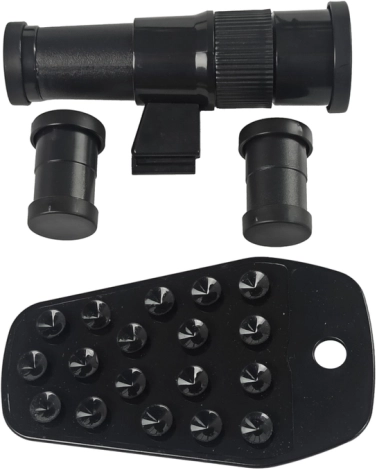 - telescoop, statief, telefoonhouder/zuignap, diagonale (prismatische) prisma, 2 extra oculairs, afdekdop