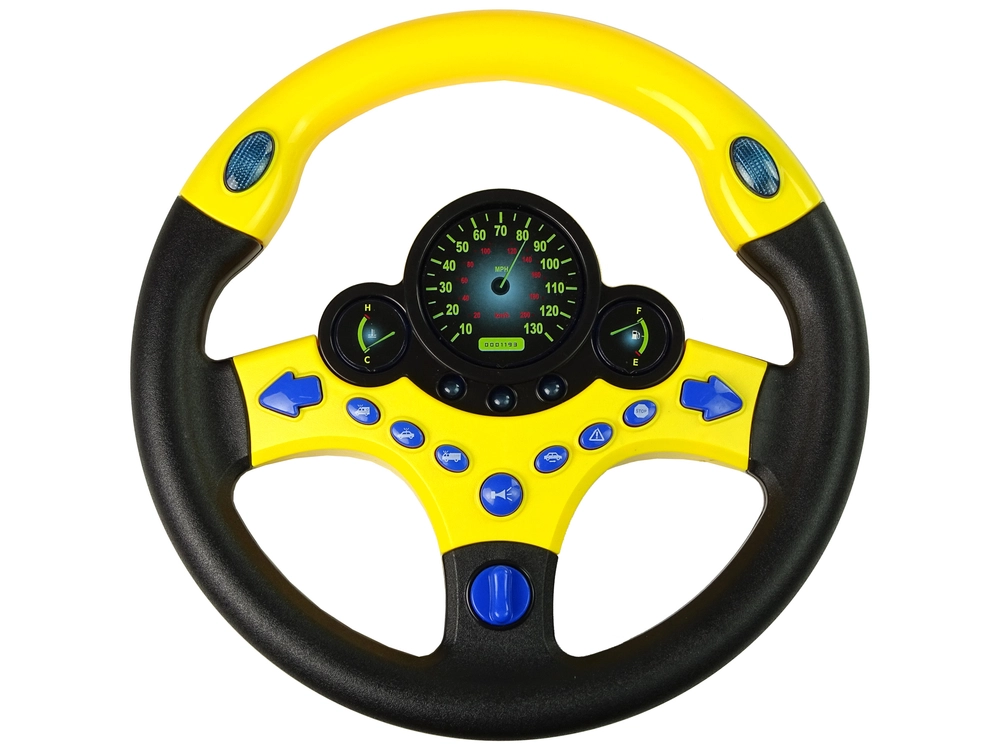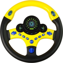 Het stuur is geel met zwart. Het heeft in totaal negen knoppen, waaronder twee richtingaanwijzers, een claxon en nood-/servicemeldingen. Draai gewoon aan het start­sleuteltje en het spel kan beginnen! De instrumenten op het stuur lichten blauw op. Dankzij het uiterlijk en de LED’s zal je peuter het gevoel hebben echt op de weg te zitten en zijn eigen auto te besturen. Het stuur ligt perfect in de hand van je peuter. Het is tijd voor je kind om het rijden te simuleren.