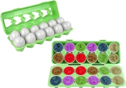 Bij het combineren oefenen kinderen oog-handcoördinatie, waarneming van kleuren en vormen en verbeteren zij geheugen en concentratie. Duurzame en veilige materialen zorgen voor een lange levensduur en zorgeloos spel. De compacte afsluitbare doos in de vorm van een eierdoos maakt opbergen en meenemen eenvoudig.