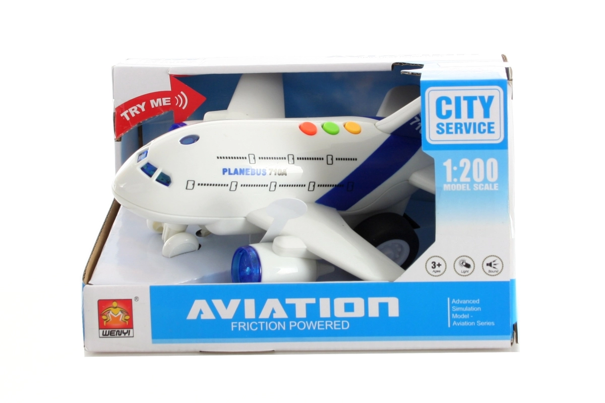 Batterijvliegtuig met licht en geluid. Voeding: 3x AG13 (inbegrepen). Afmeting van het vliegtuig ca. 20 x 17 cm. Afmetingen van de verpakking ca. 21,5 x 15 x 13 cm. Leeftijd 3+