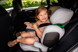 Snelle en zekere bevestiging in de auto dankzij ISOFIX. Een zichtbare indicator bevestigt de juiste vergrendeling en verkleint de kans op foutieve montage.