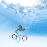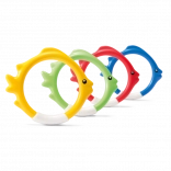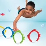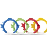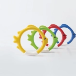 De set duikringen IN TEX in de vorm van vissen is een ideale hulp voor spelenderwijs leren duiken. Dankzij de opvallende kleuren en de stabiele positie op de bodem van het zwembad vinden kinderen gemakkelijk hun doel en oefenen ze graag met adem inhouden en oriëntatie onder water.