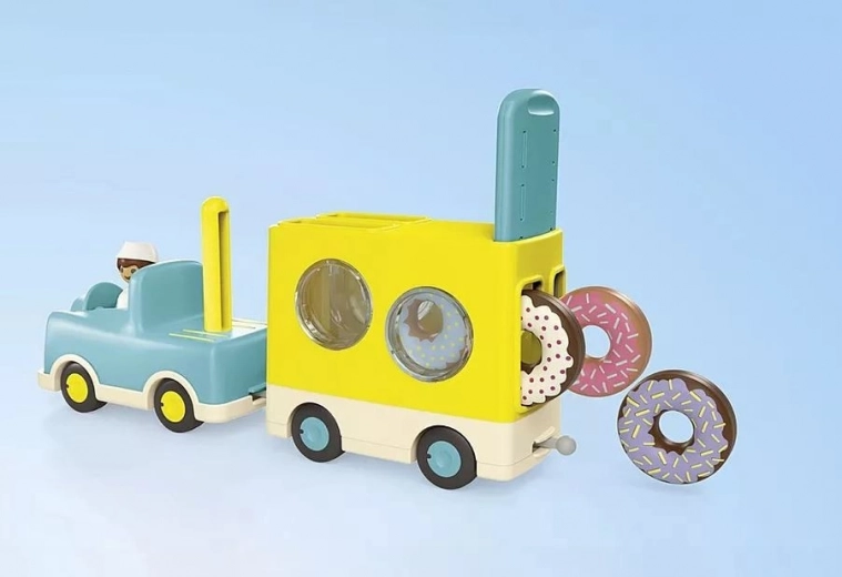 Deze kleurrijke set biedt kinderen de eerste stapjes in de wereld van rollenspel: de bestuurder in het blauwe autootje trekt een gele aanhanger versierd met grote donuts. Kinderen kunnen de donuts stapelen en sorteren, hun fantasie gebruiken en eigen verhalen bedenken over een rijdende bakkerij.