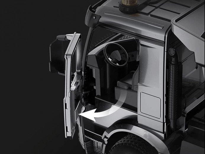 Deze verfijnde RC-kiepwagen Mercedes‑Benz AROCS biedt een maximaal realistische ervaring: originele grille met logo, natuurgetrouwe cabine met openslaande deuren en indrukwekkende licht- en motorgeluiden, richtingaanwijzers en achteruitrijsignaal. De metalen laadbak en het hefmechanisme zorgen voor duurzaamheid en authenticiteit.
