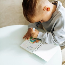 De spiraalbinding maakt omslaan eenvoudig, het compacte formaat 12 × 14 cm past perfect in de rugzak. De activiteit ontwikkelt fijne motoriek, oog-handcoördinatie en creativiteit zonder risico op vlekken.