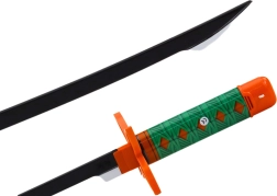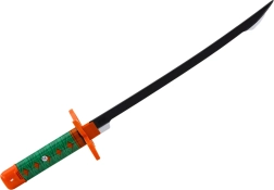 Dit samuraizwaard voor kinderen bootst trouw de legendarische nichirin-stijl na – met een zwart lemmet en een oranje-groene handgreep met geometrisch patroon voor een stevige en comfortabele grip. Het veilige kunststof lemmet met een lengte van ca. 40 cm en een handgreep van ca. 15 cm ondersteunt veilig en creatief spel.