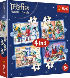 Geniet van feestelijk puzzelplezier met de geliefde Treflici-figuurtjes. Deze set biedt 4 puzzels in één verpakking met progressieve moeilijkheid – 12, 15, 20 en 24 stukjes. Elk beeld meet na het leggen ca. 28,5 × 20,5 cm en met het toenemende aantal stukjes neemt de grootte van de stukjes af voor een vloeiende vaardigheidsontwikkeling.