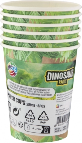 Vrolijk het kinderfeest op met stijlvolle bediening: papieren bekers met een dinosaurusthema hebben een inhoud van 250 ml, de verpakking bevat 6 stuks en ze zijn wegwerp en gemakkelijk te recyclen.