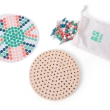 - 1 rond bord, 217 pinnetjes, 6 dubbelzijdige voorbeeldkaarten, katoenen tas