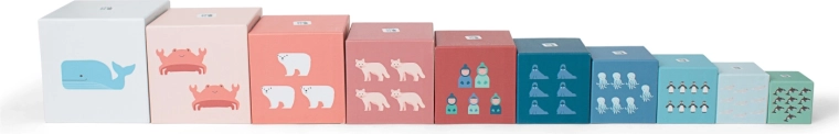Deze stapelpiramide bevat 10 kubussen met geleidelijk kleinere afmetingen. Kinderen kunnen een toren bouwen volgens de cijferreeks en dierenafbeeldingen, of de kubussen naast elkaar rangschikken. Tijdens het spelen oefenen ze op speelse wijze tellen, concentratie en ruimtelijk inzicht.