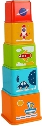 De verschillende maten bekers laten kinderen een hoge piramide bouwen en tegelijk het sorteren oefenen dankzij de openingen in de vorm van voertuigen.