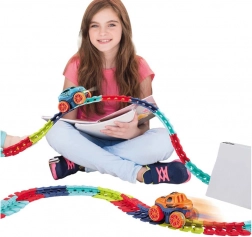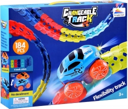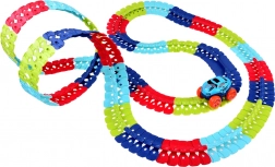 Deze kleurrijke racebaan van duurzaam plastic bestaat uit 184 koppelbare segmenten die je naar wens kunt buigen en herconfigureren. Creëer een dynamisch parcours vol bochten, lussen en hoogteverschillen – de geleiderail in het midden helpt het autootje veilig op de baan te houden. Na het plaatsen van 3× AAA (niet inbegrepen) rijdt het autootje vooruit met één druk op de knop en licht het rood en groen op tijdens het rijden.