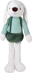 Een schattig pluchen konijn van 60 cm hoog in een gestreept T‑shirt en groene bretels maakt elk kind blij. Het is gemaakt van uitzonderlijk zacht, aaibaar materiaal, heeft een geborduurd neusje, veilige kunststof oogjes en een vriendelijke glimlach – ideaal om mee te knuffelen, spelen en slapen.
