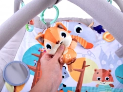 Deze schattige en zachte speelmat in zachte tinten met contrasterende graphics is ideaal voor de allerkleinsten. De verhoogde zachte randen verhogen de veiligheid bij het rollen, terwijl de afneembare babygym met ringen het eenvoudig maakt om speeltjes toe te voegen of te wisselen. Dankzij het veilige spiegeltje, de rammelaars en de knisperende elementen wordt je kindje vermaakt en tegelijk zintuiglijk geprikkeld.