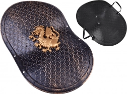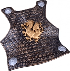 Gedetailleerd reliëf en decor in antiekgoud met een drakenembleem geven het kostuum een indrukwekkend, middeleeuws karakter.