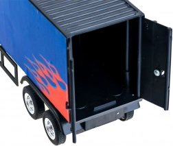 Een fantastische speelgoedset voor alle jonge autoliefhebbers die dromen van het besturen van een Amerikaanse trekker. Deze vrachtwagen met oplegger op afstandsbediening in blauw en rood met vurige details biedt niet alleen een esthetische beleving, maar ook functionele features. Gemaakt van kunststof, wat duurzaamheid en eenvoudige hantering garandeert. De set bevat een afneembare oplegger en te openen deuren voor het laden van goederen, wat het spel extra realistisch maakt.