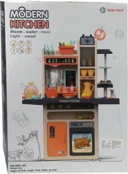 Onderdeel van de keuken zijn licht- en geluidseffecten die echte kookgeluiden nabootsen. Kinderen kunnen spelen met elementen zoals een koelkast en oven, wat bijdraagt aan de realistische en speelse beleving.
