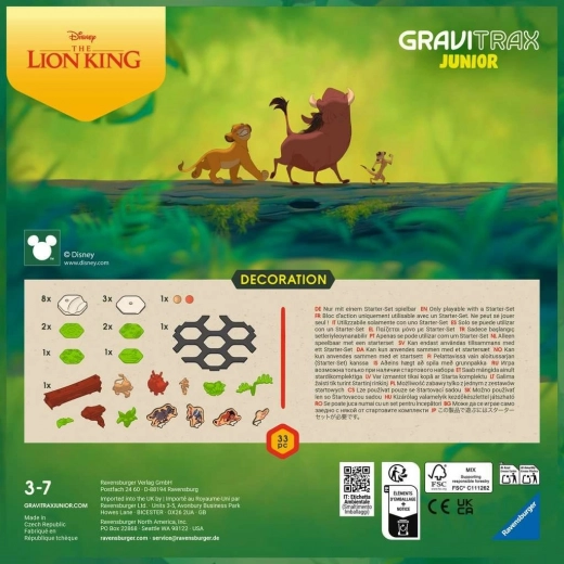 Creëer voor je kinderen een magische wereld met de GraviTrax Junior Disney: De Leeuwenkoning uitbreiding. De set bevat figuren van Simba, Pumbaa en Timon en rijke decoratieve elementen, waarmee je de knikkerbaan verandert in je eigen wereld van De Leeuwenkoning. Stimuleert creativiteit, fijne motoriek en rollenspel, is gemaakt van houten bioplastic en bevat 33 onderdelen.