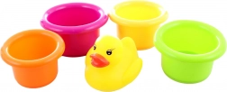 Vrolijk badspeelgoed voor de allerkleinsten, dat plezier brengt en helpt bij het ontwikkelen van motorische vaardigheden met behulp van gekleurde bekertjes en een klassieke gele badeend.