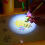 De projector projecteert heldere voorbeelden van schijven direct op het tekenoppervlak, zodat kinderen eenvoudig kunnen overtrekken en stap voor stap leren tekenen.