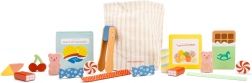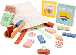 Deze houten snoepjesset is perfect voor kleine fans van winkel- of caférollenspel. Hij bevat een kleurrijke selectie houten snoepjes – van chocoladereep tot gummibeertjes – zorgvuldig vormgegeven zodat ze net echt lijken. Inclusief een praktische katoenen tas voor opbergen en houten tangetjes voor leuk serveren.