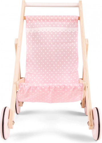 Deze stijlvolle houten poppenwagen combineert de duurzaamheid van een natuurlijk materiaal met subtiele roze textiele details. Hij is stabiel, gemakkelijk te besturen en dankzij de rubberen ringen op de wieltjes zeer stil – ideaal voor in huis en de kinderkamer. De hoogte van het duwhandvat van 50 cm zorgt voor comfortabel duwen voor kleuters.