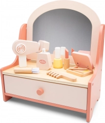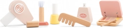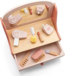 De set bevat houten accessoires zoals een borstel, lippenstift, parfumflesje, föhn, nagellak, oogschaduwpalet en penseel, die creatief spel stimuleren.