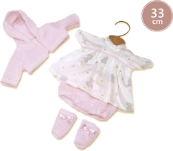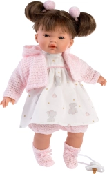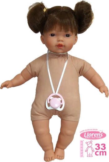 Functionaliteit: Na het verwijderen van de fopspeen uit de mond zegt de pop 'mama', 'papa' en maakt het een echt huilend babygeluid. Deze geluiden kunnen worden gedempt met de magnetische fopspeen. Het model wordt geleverd zonder kleding; we raden aan om originele Llorens-kleding te kopen voor de maat van 33 cm.
