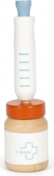 Een houten spuit met veermechanisme, medicijndoos en andere hulpmiddelen ondersteunen authentiek speelplezier bij de verzorging van het huisdier.