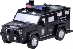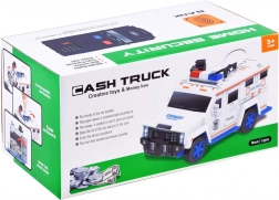 Politieauto met opschriften “POLICE” en “CASH TRUCK”, zwaailichten