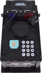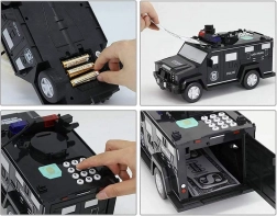 Deze interactieve spaarpot in de vorm van een politieauto beschermt kinder­sparen en vermaakt tegelijk. Kinderen voeren een beveiligingscode in (standaard 0000), bevestigen via de vingerafdrukscanner (simulatie) en openen de kluisdeur. Bankbiljetten worden automatisch ingevoerd via de voorste sleuf, munten via de bovenopening onder de klep.