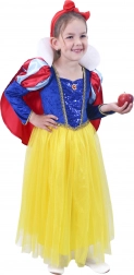 Het kostuum in klassieke kleuren met een blauw lijfje, gele rok en rode accenten zorgt direct voor een sprookjesachtige sfeer – perfect voor kleine prinsesjes.