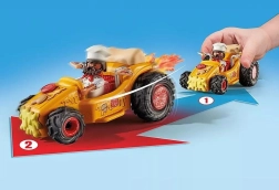 Het voertuig heeft plaats voor een PLAYMOBIL-figuur en zorgt dankzij de praktische pull-back aandrijving voor direct speelplezier zonder batterijen. De vrolijke carrosserie kan worden versierd met diverse accessoires, zodat kinderen hun racemachine helemaal naar eigen smaak kunnen personaliseren.