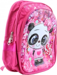 De rugzak is versierd met een schattige panda met een strikje en een lolly, wat het een speelse en aantrekkelijke uitstraling geeft voor jonge kinderen.