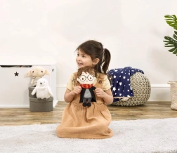 Deze officieel geïnspireerde knuffel draagt de iconische zwarte mantel en een rood-gele (Griffoendor) sjaal, die samen met de ronde bril en het bliksemlitteken trouw herinneren aan de geliefde tovenaar. Perfect voor de zintuiglijke ontwikkeling en rustgevende rituelen voor het slapen.