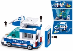 Deze politiewagen is opgebouwd uit koppelbare plastic bouwstenen en bevat functionele elementen zoals een satellietantenne en bewegende deuren.