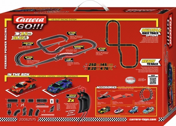 Beleef de spanning van echte races met de CARRERA GO Ferrari Power Racing autobaanset van 8,6 m. De set bevat twee gedetailleerde FERRARI 296 GT3-auto’s, een kruising, gebankte bochten, een baanversmalling en een rondenteller. Dankzij de controllers met Turbo-functie, magneten en dubbele contactborsteltjes geniet je van snelle en vloeiende ritten met hoge grip. Eenvoudige montage met het clipsysteem en ruime uitbreidingsmogelijkheden zorgen voor oneindig plezier voor kinderen vanaf 6 jaar en volwassenen.