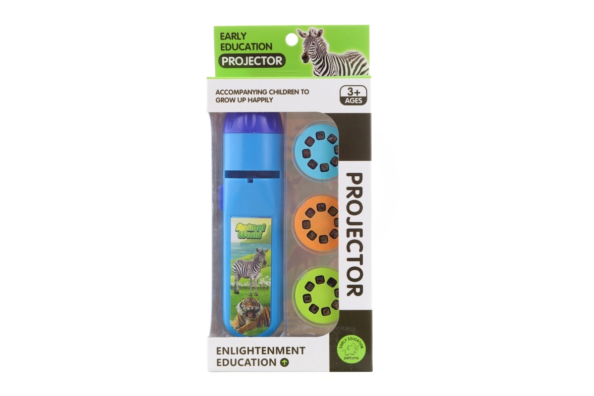 Kunststof projector op batterijen. Inclusief 3 schijven met afbeeldingen (in totaal 24 afbeeldingen). Bij het indrukken van de knop projecteert de projector de afbeeldingen op de muur (of een ander wit oppervlak). Werkt op 3 AG13-batterijen (meegeleverd). Afmetingen van de projector ca. 13 x 3,5 cm. Afmetingen van de verpakking ca. 9,5 x 20,5 x 4 cm. Leeftijd 3+.