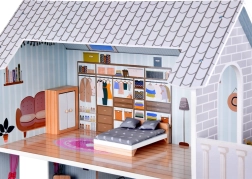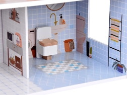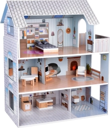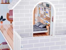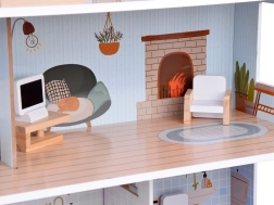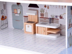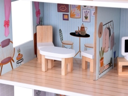 Deze stijlvolle houten poppenvilla biedt drie verdiepingen vol plezier en veel ruimte voor fantasie. Kinderen ontdekken een keuken, badkamer, woonkamer, eetkamer en een ruime slaapkamer met balkon. Realistisch behang, vloeren en kleine decoraties in pastelkleuren creëren een knusse sfeer voor eindeloze verhalen.