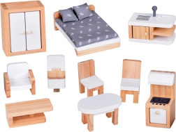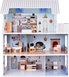 De verpakking bevat een uitgebreide set meubels, waarmee je de afzonderlijke kamers eenvoudig kunt inrichten. De constructie van duurzaam hout, gladde randen en niet-giftige materialen garanderen veilig spelen. Die montage is snel en intuïtief – de onderdelen zijn genummerd en de geïllustreerde handleiding leidt je stap voor stap.