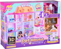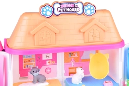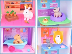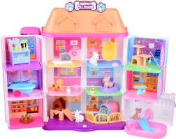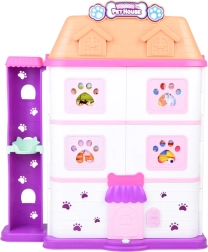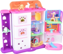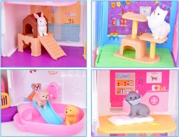 Het huisje biedt 11 doordachte kamers, een lift met mand, een terras met zwembad en glijbaan en een deurbel voor nog realistischer spel. De set bevat rubberen figuurtjes (2 hondjes, 2 katjes en een konijntje) en tal van accessoires – van bad en bakjes, via mandjes en krabpalen, tot onderzoekstafel en ziekenhuisbed.