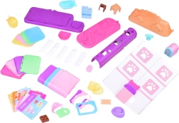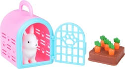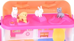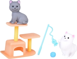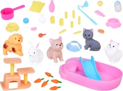In de doos vind je 2 hondjes, 2 katjes en een konijntje van zachte rubber, samen met meubels en accessoires voor verzorging, spel en ontspanning.