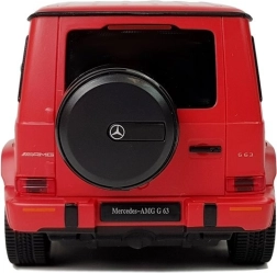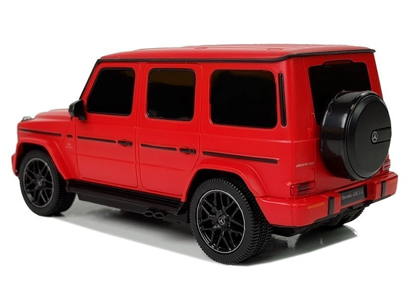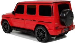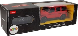 Het afgebeelde model is de MERCEDES AMG G63 in het rood, perfect gereproduceerd naar het realistische voorbeeld. Het is uitgevoerd op schaal 1:24, het chassis is gemaakt van verstevigd kunststof, rubberen wielen imiteren banden en de vering van de auto is gedempt.