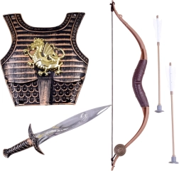 De set bevat harnas, boog, twee pijlen en een zwaard – de ideale combinatie voor fantasiegevechten en carnavalskostuums.