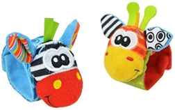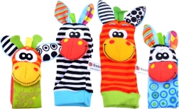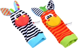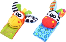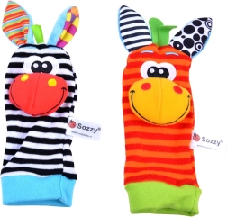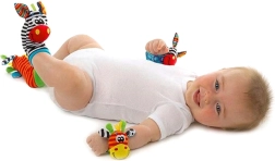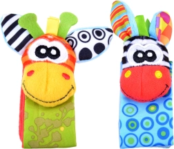 Rammelsokken en polsbandjes moedigen aan tot trappelen en met de handjes zwaaien, en ondersteunen zo op natuurlijke wijze motoriek en coördinatie.