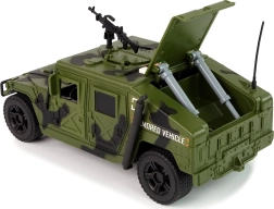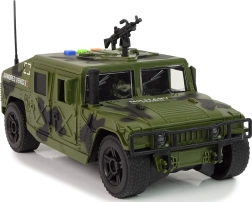 Als uw kind geïnteresseerd is in militaire thema's en vooral in voertuigen, zal deze militaire auto zijn passie aanwakkeren en hem in staat stellen de geheimen van de militaire wereld te ontdekken. Het militaire voertuig is de perfecte aanvulling op de collectie van elke kleine liefhebber van het leger en militaire motieven. Het is ontworpen om kleine soldaten aan te spreken die dit heroïsche, maar gevaarlijke beroep bewonderen. Met militaire kleuren en een brede carrosserie lijkt het op een echt militair voertuig, inclusief een pistool op het dak.