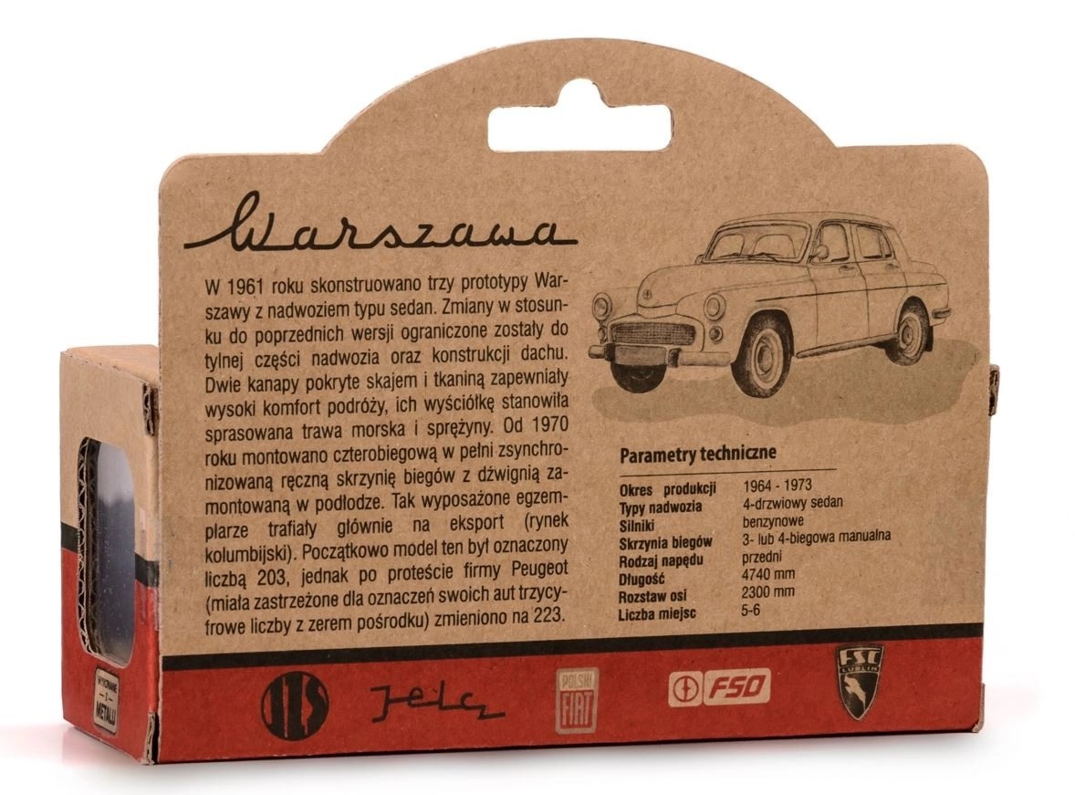 Warszawa 223 is een model van de bekende Poolse auto, die in 1961 werd ontworpen met een sedan carrosserie. Het elegante ontwerp en de zorgvuldig uitgewerkte details maken het een ideale aanvulling voor elke modelautoverzameling. De belangrijkste kenmerken van dit model zijn onder andere: